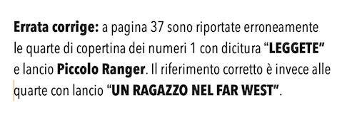 Poi ci sono errori che proprio non dovrei commettere. Uno piuttosto grave mi è stato segnalato a pagina 37, nella cronologia della 2ª Serie Gigante di Tex, dove ho indicato due numeri 1 NC con la dicitura “Leggete” con Piccolo Ranger in IVᵃ di copertina, invece di “RFW”. Colpa del copia-incolla fatto con troppa leggerezza, anche se mi consola sapere che, nelle centinaia di pagine delle mie cronologie, compresa la guida Tex in edicola, quei due numeri 1 sono sempre riportati correttamente.